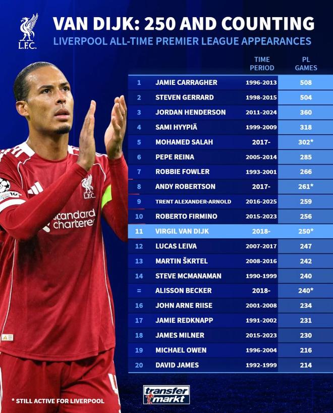 利物浦英超出场数TOP20:卡拉格508场第1,范戴克250场第11